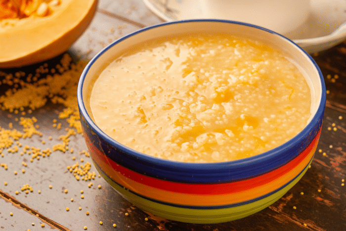 小米南瓜粥的作法是,準備南瓜200公克、小米50公克,把南瓜切塊、小米洗淨,放入滾水,小火煮30分鐘。中間注意要不時攪拌,以免沾鍋。